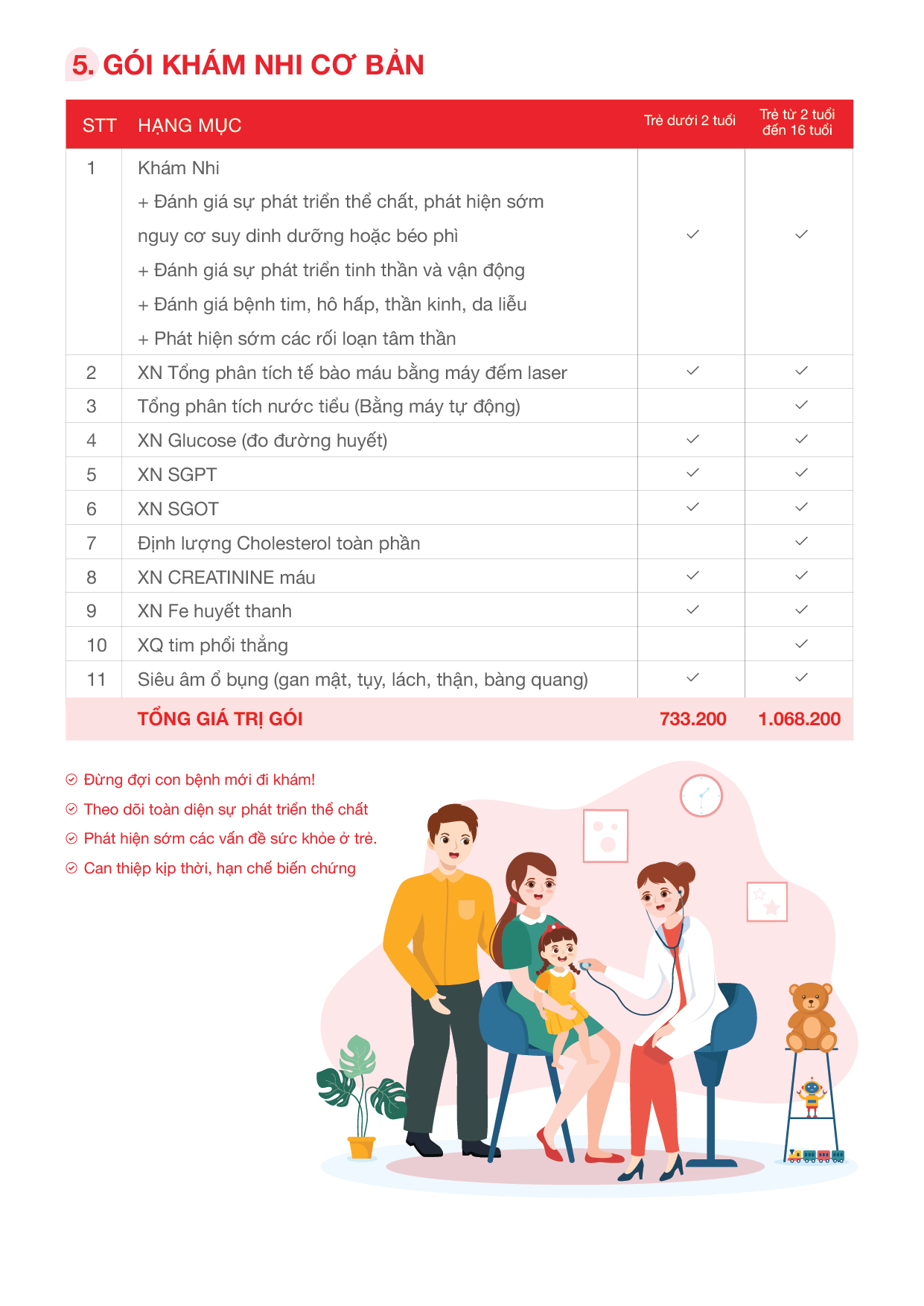 Nhiều bệnh lý ở trẻ diễn tiến âm thầm, không có dấu hiệu rõ ràng. Gói khám nhi cơ bản giúp phát hiện sớm – can thiệp kịp thời, cho con phát triển khỏe mạnh ngay từ đầu.