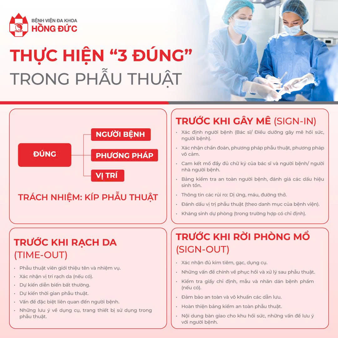 Tại Bệnh viện Hồng Đức, sự an toàn của người bệnh luôn là ưu tiên hàng đầu. Chúng tôi tuân thủ nghiêm ngặt quy tắc "3 Đúng": Đúng người bệnh - Đúng phương pháp - Đúng vị trí. Quy trình kiểm soát chặt chẽ qua 3 giai đoạn: Trước gây mê (Sign-in), Trước rạch da (Time-out) và Trước khi rời phòng mổ (Sign-out) nhằm đảm bảo cuộc phẫu thuật diễn ra chính xác và an toàn nhất