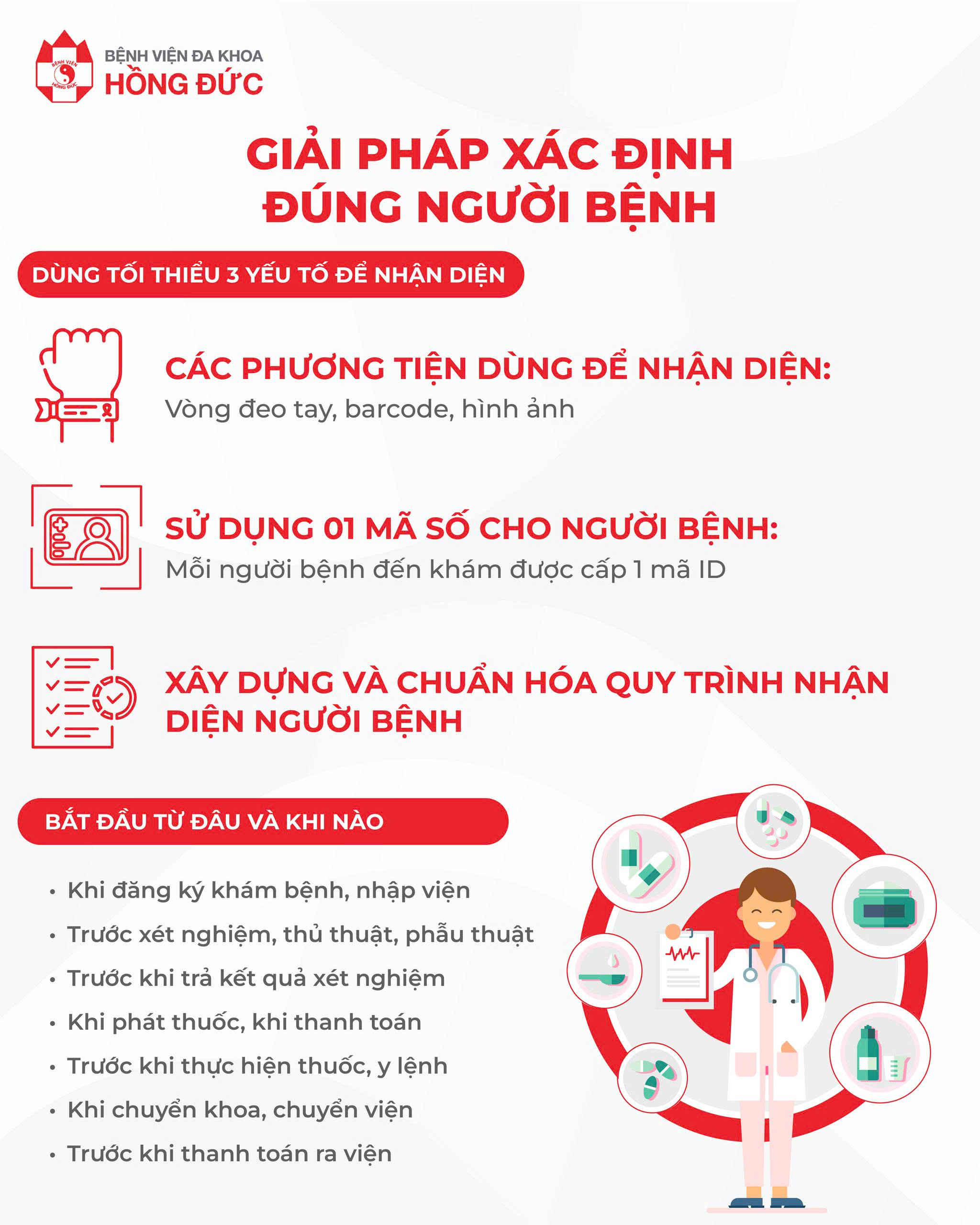Tại Bệnh viện Đa Khoa Hồng Đức, an toàn người bệnh luôn là kim chỉ nam trong mọi hoạt động khám chữa bệnh. Để loại bỏ tối đa các nguy cơ nhầm lẫn và đảm bảo sự chính xác tuyệt đối, chúng tôi áp dụng quy trình "Xác định đúng người bệnh" được chuẩn hóa nghiêm ngặt.
