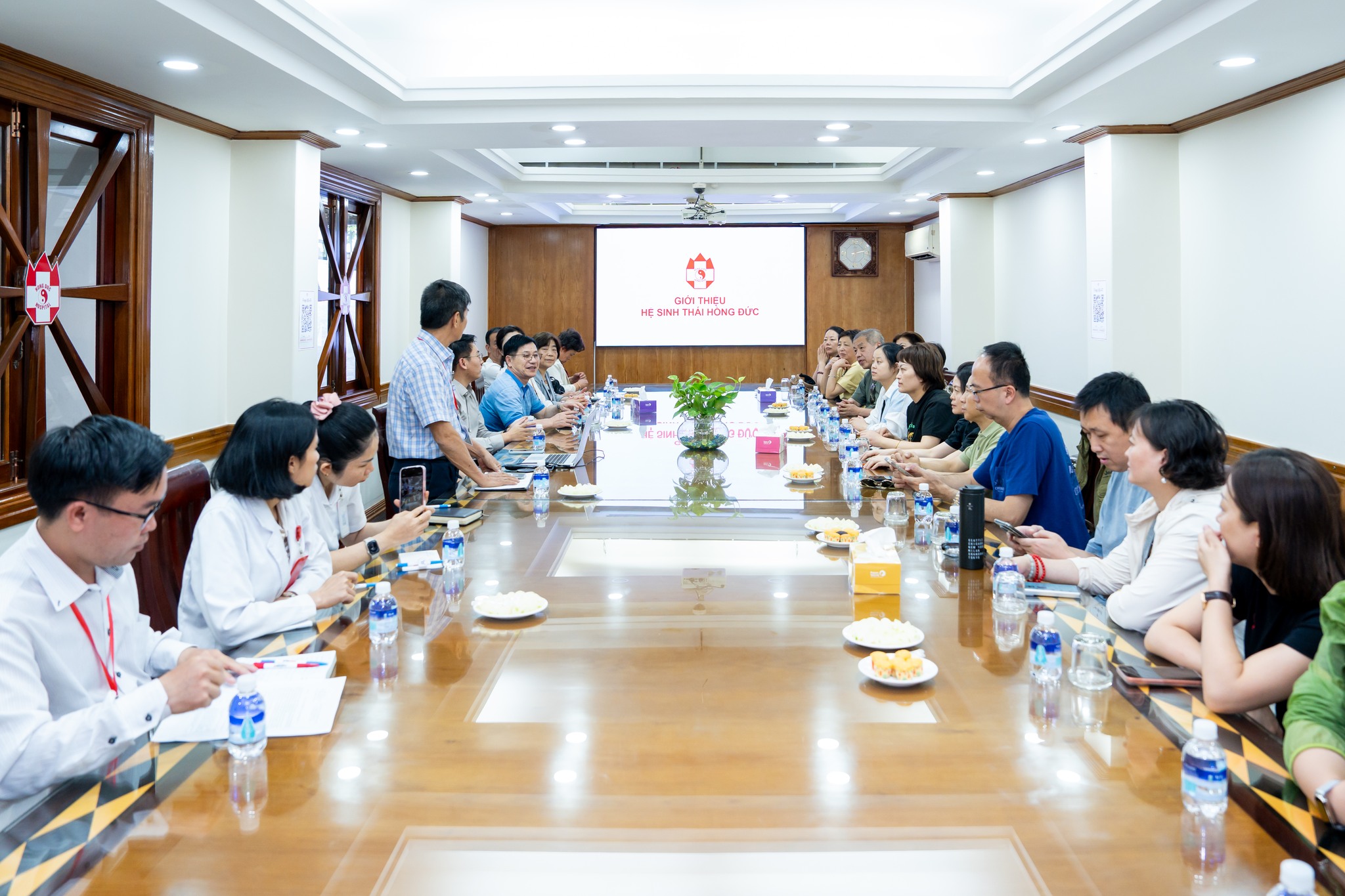 TS. BS Phạm Văn Dũng, Giám đốc điều hành Bệnh viện đa khoa Hồng Đức III trao đổi với đoàn, hệ thống Bệnh viện Đa khoa Hồng Đức hiện có 2 cơ sở là Bệnh viện Hồng Đức III với chuyên khoa mũi nhọn về điều trị ung bướu và Bệnh viện đa khoa Hồng Đức II chuyên khoa mũi nhọn về điều trị tim mạch. Cả hai cơ sở đã được trang bị nhiều trang thiết bị y tế hiện đại giúp điều trị những ca phẫu thuật phức tạp.