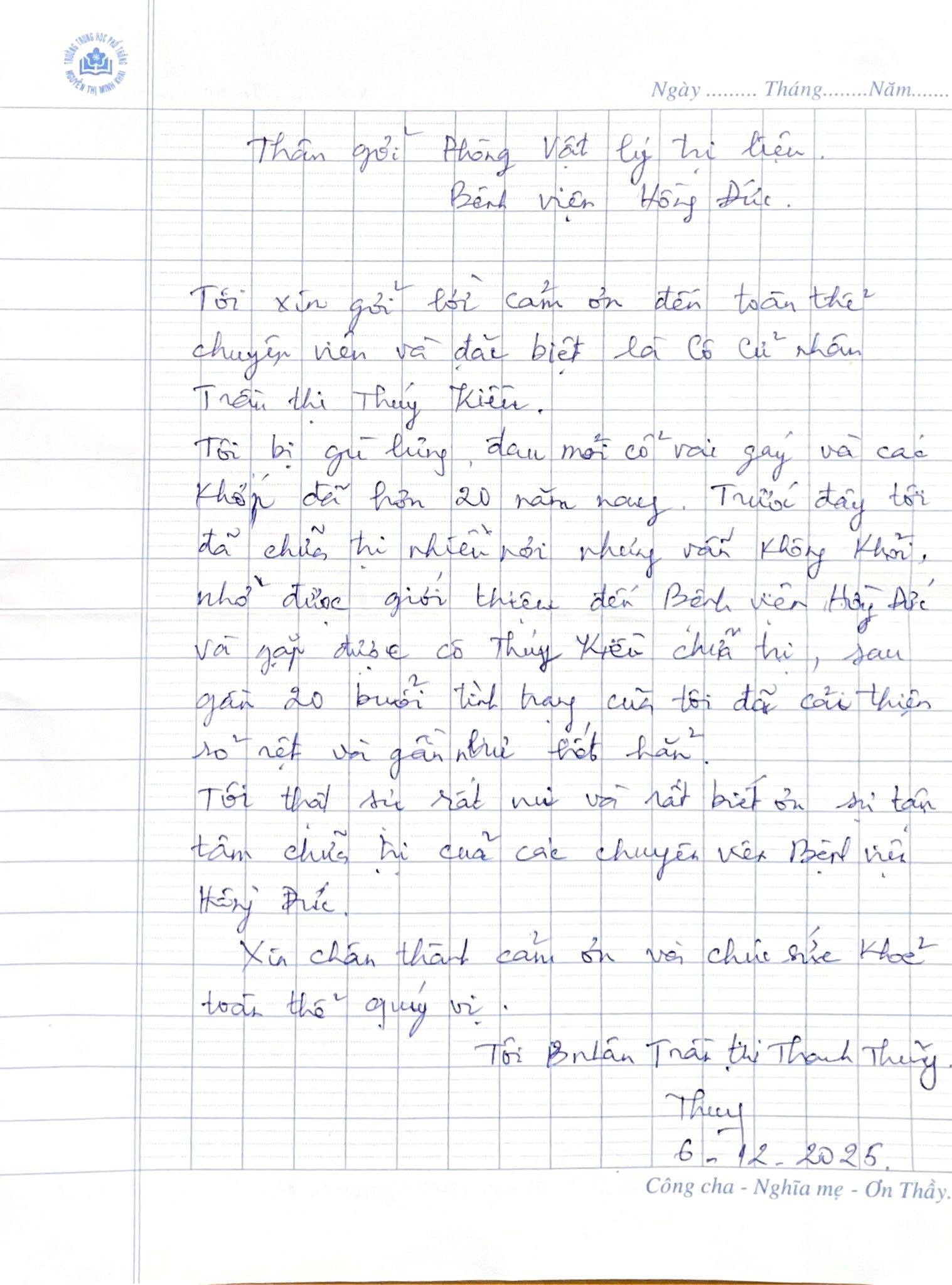 Thư cảm ơn của bà Thủy gửi đến bệnh viện.